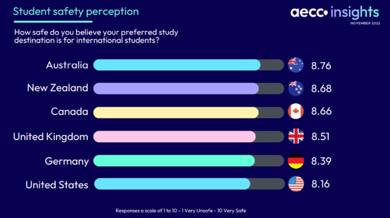 AECC(AECC Insights Student Survey)近日發(fā)布的《全球留學(xué)趨勢報(bào)告》中顯示,澳大利亞以8.76分(滿分10分)的高分位居榜首,被認(rèn)為是最安全的留學(xué)目的地;